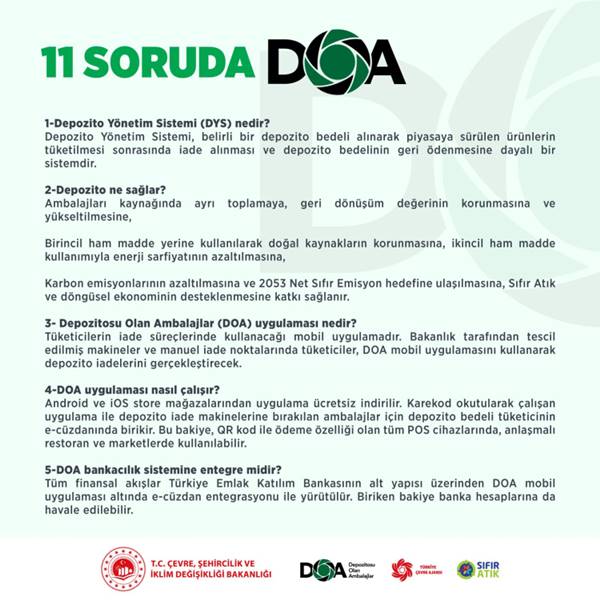 Tüketicilerin iade süreçlerinde kullanacağı mobil uygulama “Depozitosu Olan Ambalajlar (DOA)” da kullanılmaya başlandı. Bu sayede cep telefonlarına DOA uygulamasını yükleyen vatandaşlar depozito iade makinelerine QR kod okutup iade ettikleri ambalajlara karşılık gelen teşvik bedelini dijital cüzdanlarında biriktirebilecek.