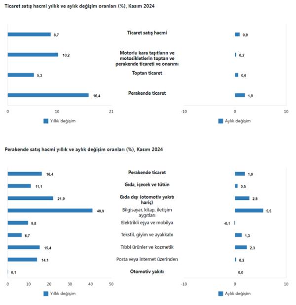 Buna göre ticaret satış hacmi 2024 yılı Kasım ayında bir önceki yılın aynı ayına göre yüzde 8,7 arttı. Aynı ayda motorlu kara taşıtlarının ve motosikletlerin toptan ve perakende ticareti ile onarımı için satış hacmi yüzde 10,2 arttı, toptan ticaret satış hacmi yüzde 5,3 arttı, perakende ticaret satış hacmi ise yüzde 16,4 oranında artış kaydetti.